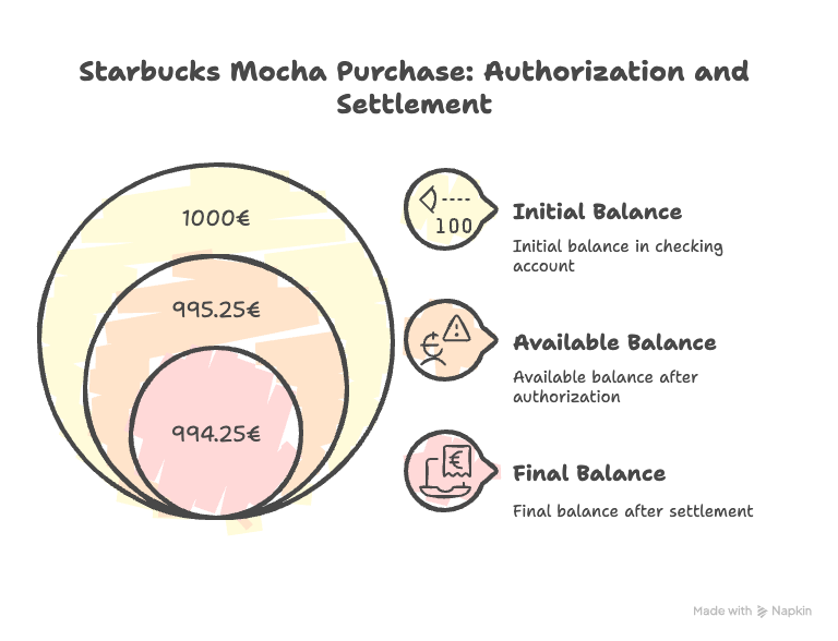 To make the concept of Clearing and Settlement stick, let’s imagine we are purchasing a mocha coffee at Starbucks’. The coffee was 4.75€, and we added a tip of 1€. The Authorization transaction, or the first part of the dual-message transaction, was for 4.75€, and that was approved before we got our mocha. The Issuer Processor checked to make sure that we had at least 4.75€ in our bank account. Our available balance went down before we ordered the mocha; we had exactly 1,000€ in our bank checking account. At the time of Authorization, there was a funds hold placed on 4.75€ out of 1,000€, but at this time, the money hadn’t moved. So, our actual bank balance remained at 1,000€ until the transaction settled. However, our available balance will show up as 995.25€. This means that if we were to go out and try to purchase something for more than 995.25€, the transaction would get declined because it exceeded our available balance.